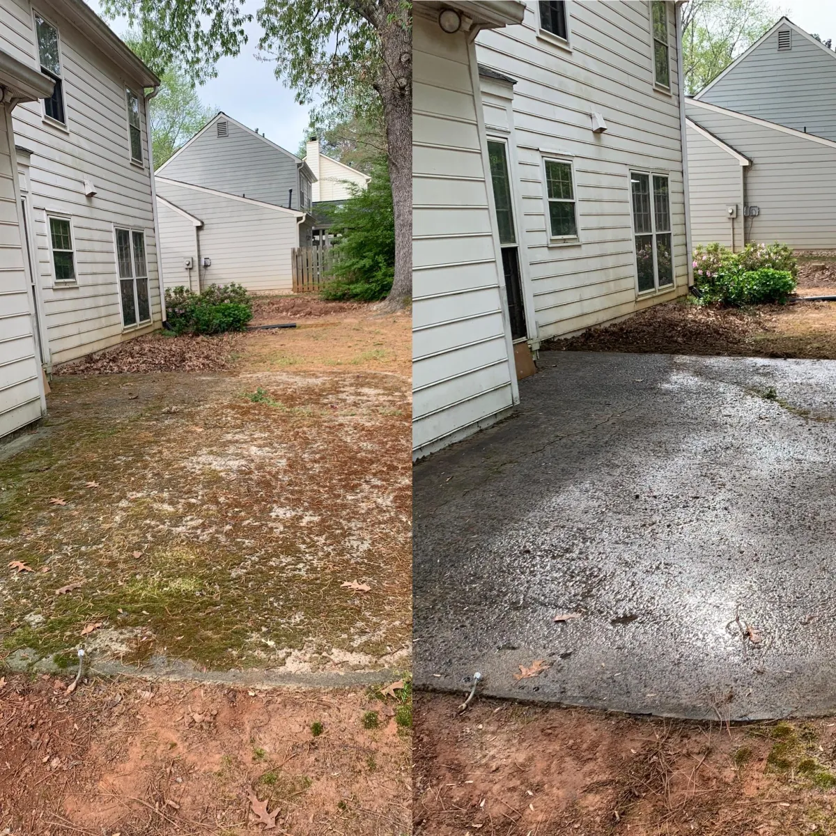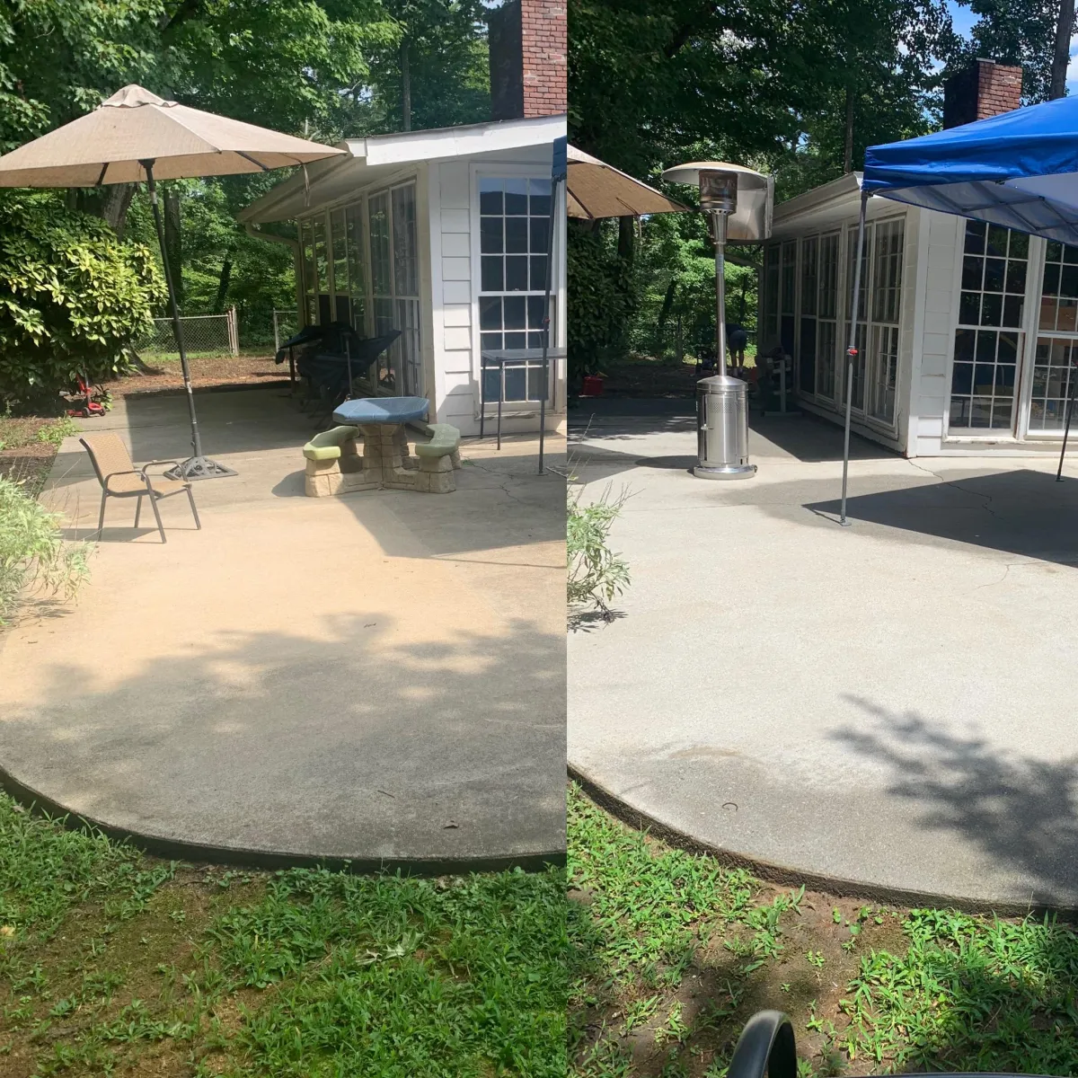Washing a concrete patio with a pressure washer removes dirt, stains, and algae, making it look new again.